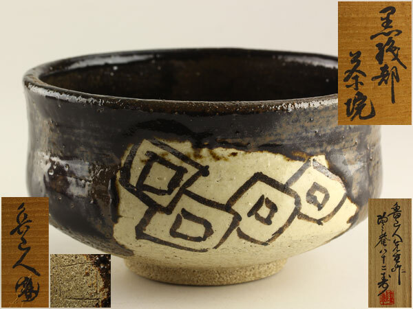 - 茶道具 北大路魯山人 黒織部 茶碗 共箱 黒田陶々庵識 J2906