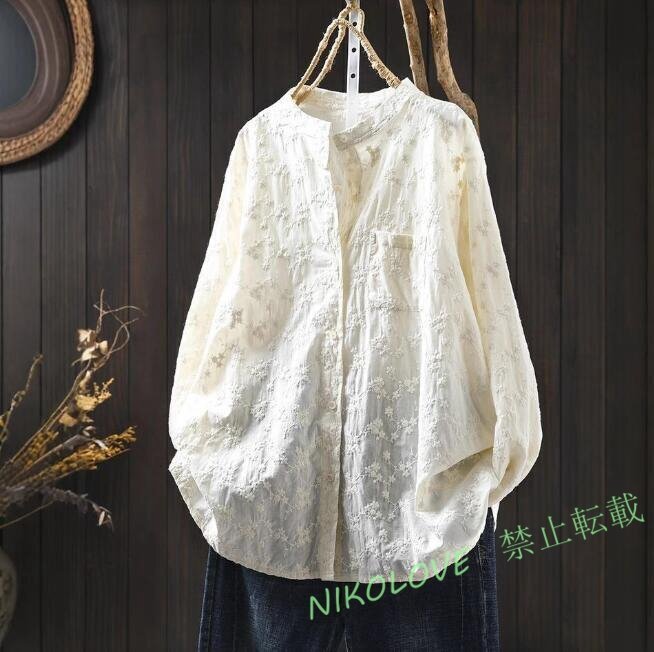 > ☆新品 ワイシャツ フリーサイズ チュニック トップス 綿100% 全刺花柄 ナチュラル 通気性肌触り抜群 オフホワイト
