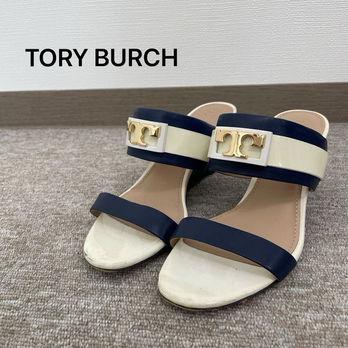 - 【963】 TORY BURCH トリーバーチ サンダル ヒール 表記サイズ5M レディース22㎝〜22.5㎝ 白 ホワイト ネイビー ゴールド