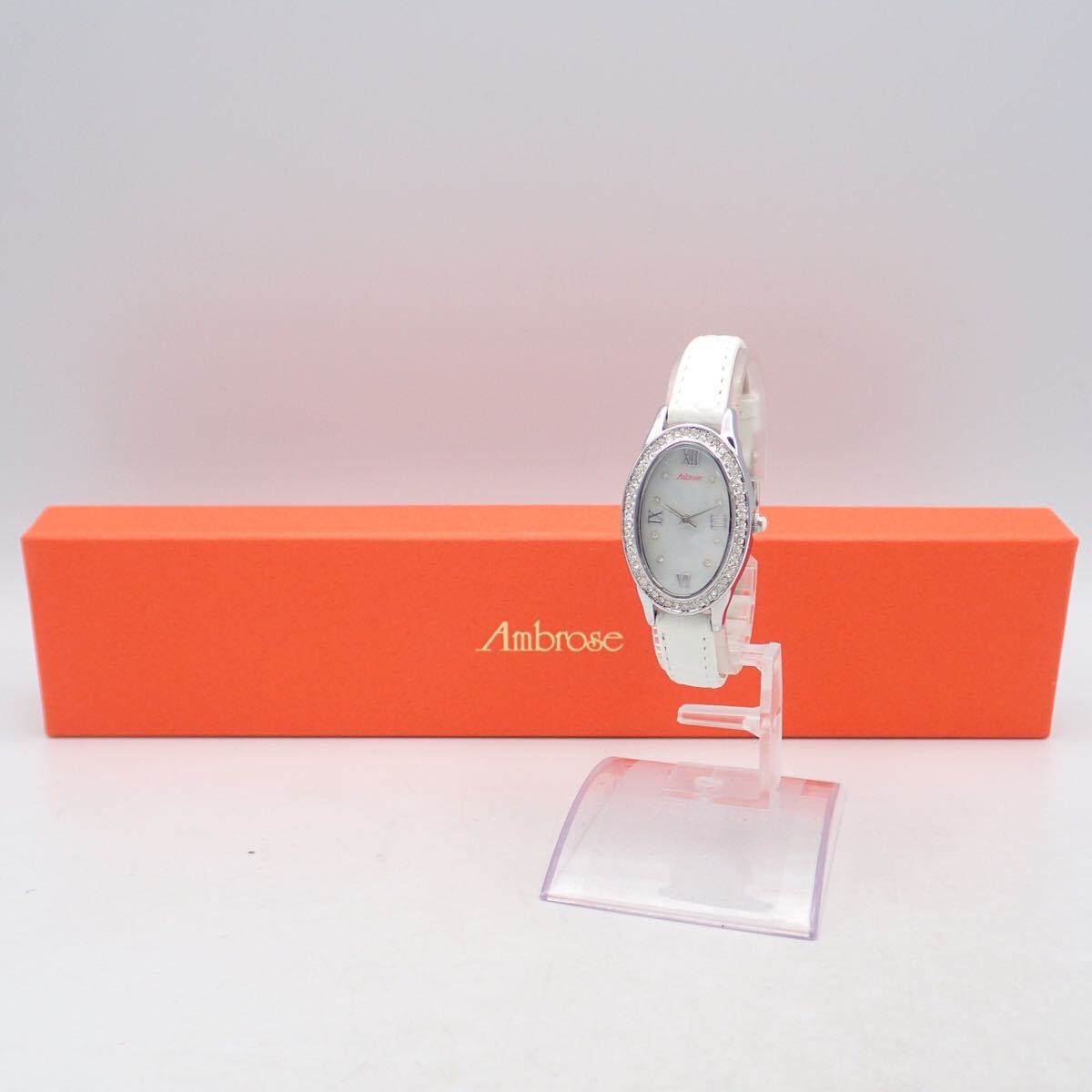 - 豊10145【極美品】Ambrose アンブローズ レディース クオーツ オーバル ラインストーン ホワイト シェル文字盤 動作確認済