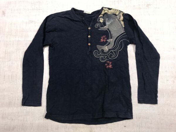 > SPACE OPERA スペースオペラ 和柄 錦鯉 波 和 アート ラメプリント ヘンリー キーネック ロンT 長袖Tシャツ カットソー メンズ L 紺