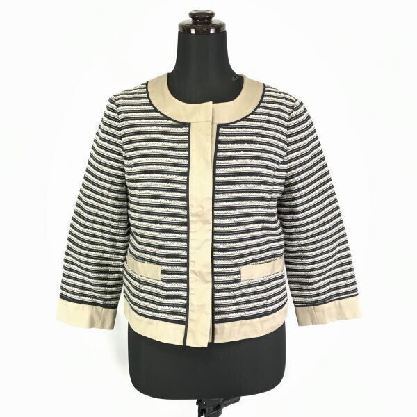 (処分市)ビームス ハート★ボーダー柄/ノーカラー/ツイードジャケット【1/レディースS/ベージュ×紺】BEAMS HEART◆BF324拍卖