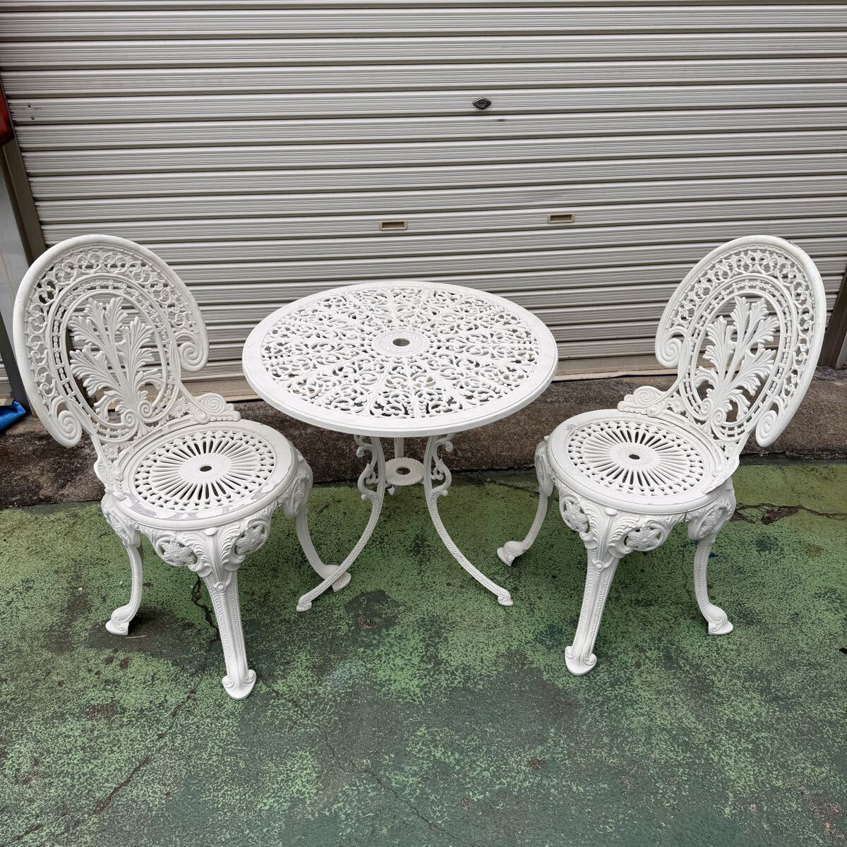 - ◆金属製 ガーデンテーブル イス 3点セット ホワイト チェア×2客 インテリア アウトドア 庭 家具 ガーデニング 280-55