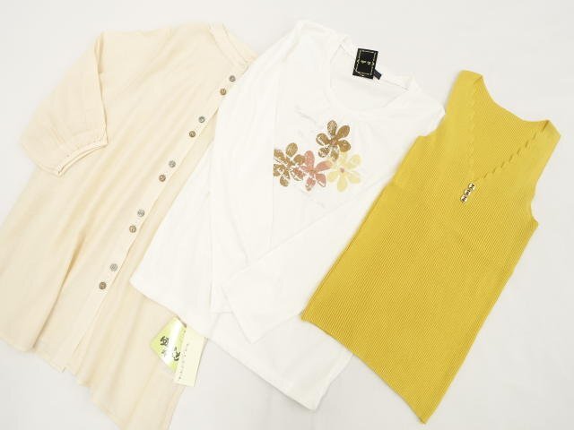 > 福袋 新品訳あり3点セット Be able&CHANTER等 長袖カットソー+7分袖ブラウス+ノースリーブニットカットソー L相当 白地 花&英字/白系/黄系