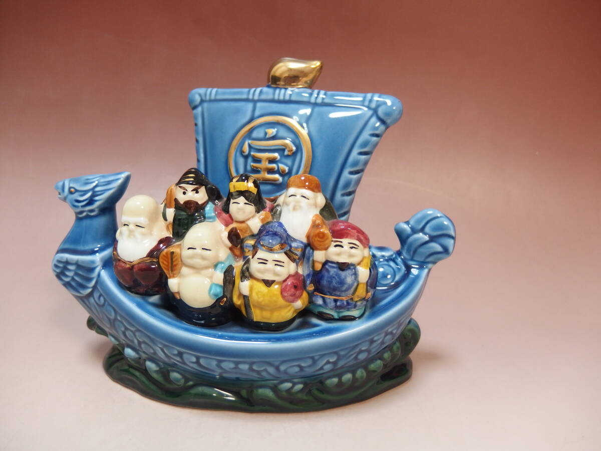 - 開運 宝船 七福神 陶器 置物 彩色 青系
