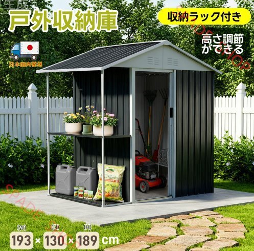 - 【国内発送】【収納ラック付き】物置 屋外 スチール 倉庫 戸外収納庫 W193*D130*H189cm 物置き おしゃれ 大型収納庫 防水ドア スチール物置