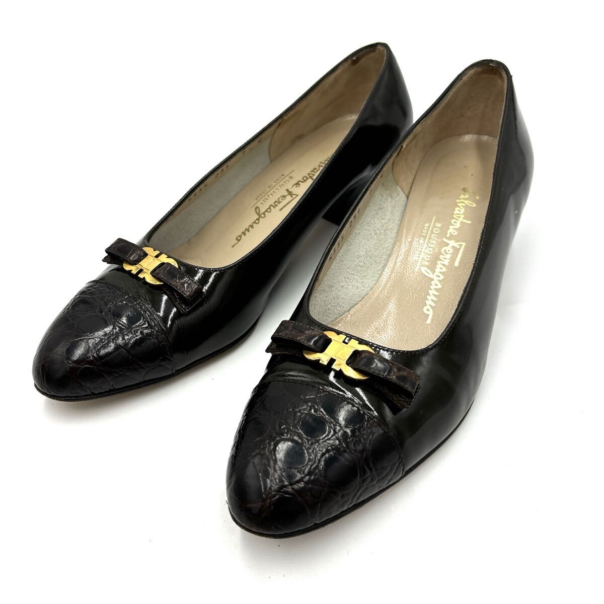 - C * イタリア製 '高級婦人靴' Salvatore Ferragamo サルヴァトーレフェラガモ 本革 クロコ型押し ガンチーニ ヒール / パンプス 7C 24cm