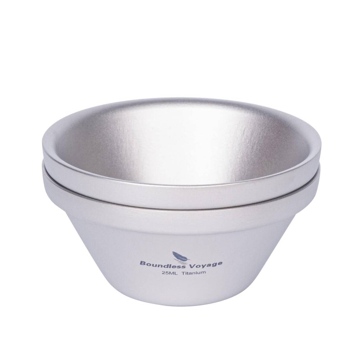 【商品仕様】:材質:純チタン/二重構造;商品寸法 (口径x底部径x高さ):5.9×3×2.7cm;重量:約16g/個;容量:約25ml。