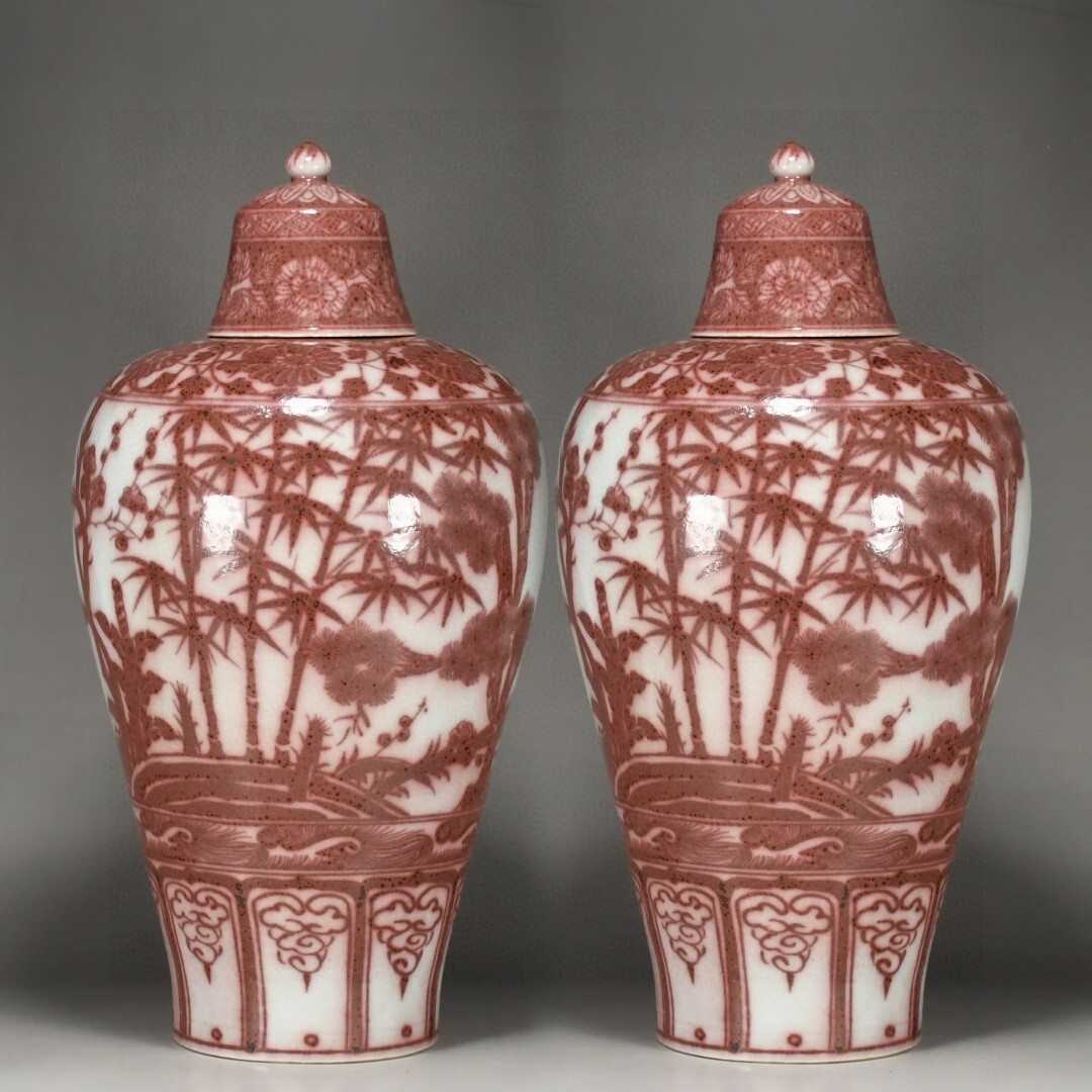 > 旧蔵 明 釉裏紅松竹梅 纏枝菊 梅瓶 對價 陶芸 古陶磁器 中国磁器 極細工 中国古玩 骨董品 古美味 210