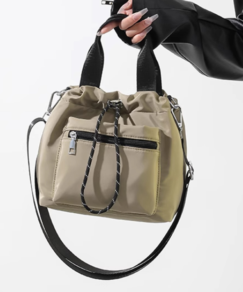 - ショルダーバッグ 巾着トート 2way 肩掛け ナイロン ポシェット ハンドバッグ ベージュ