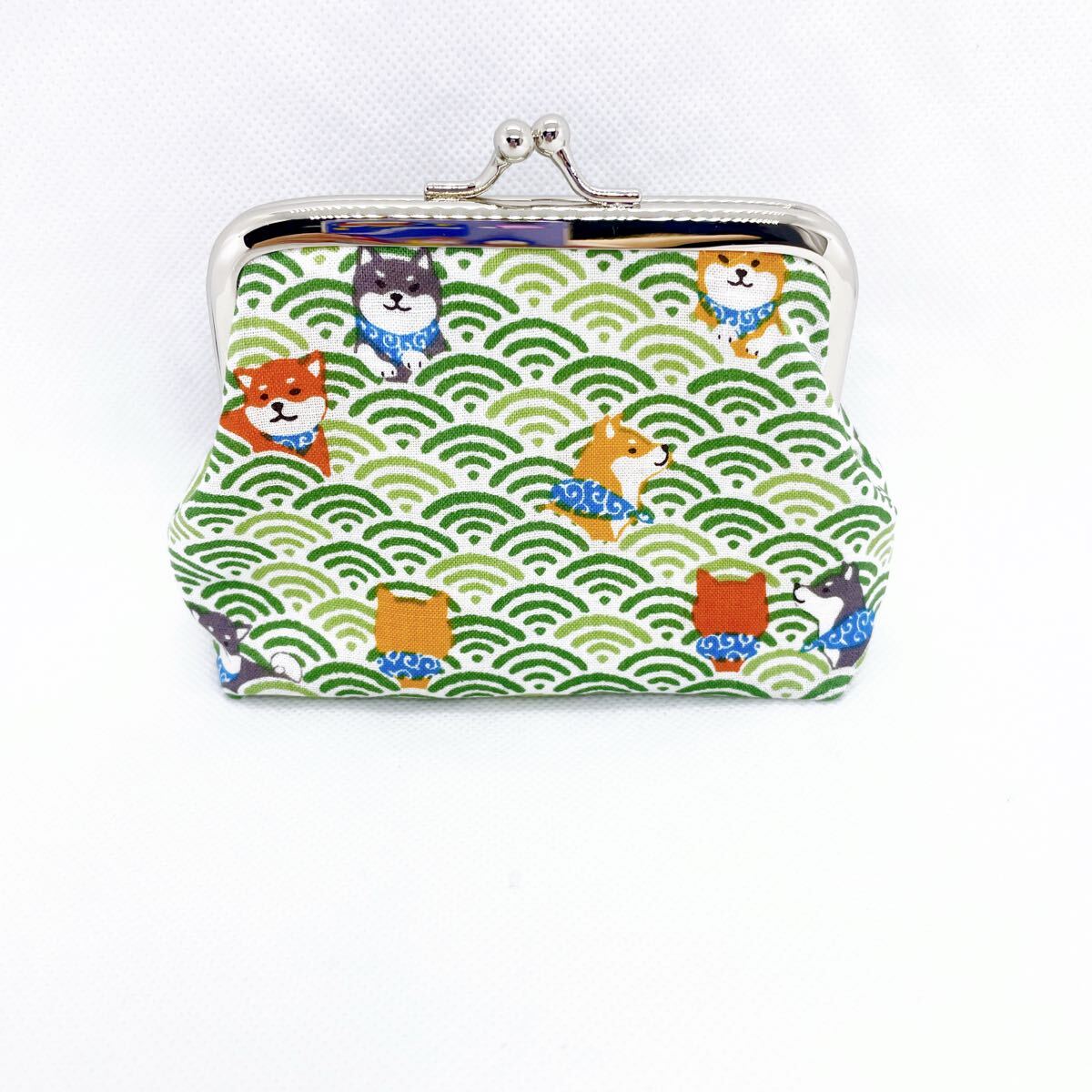 - 柴犬 和柄 波 がま口ポーチ カード 財布 グリーン
