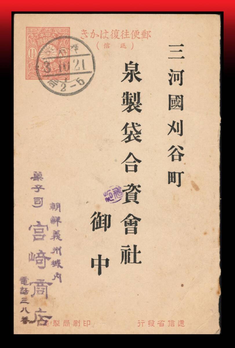 - Z45 朝鮮|赤茶分銅1銭5厘銘有り往復葉書返信部 D欄局/櫛型印:(義州)/局/3.10.21/I/后2-5※局名は住所〜 エンタイア