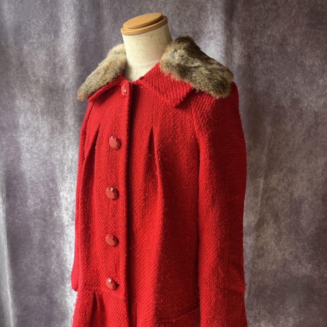 > 【美品】MICHEL KLEIN ミッシェルクラン ウールコート フェイクファー襟 レッド レディース アウター 上品 エレガント 冬物