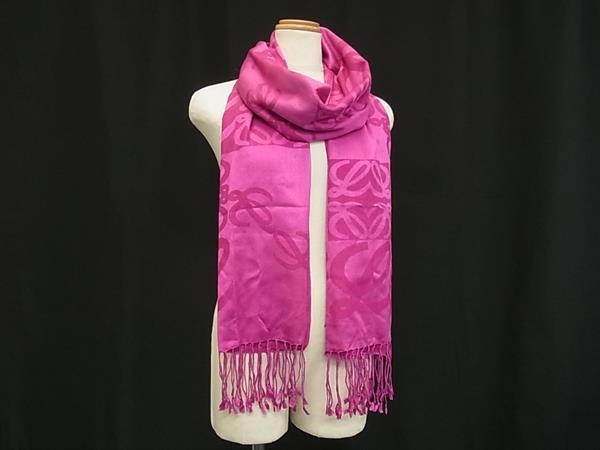 > 1円 LOEWE ロエベ アナグラム カシミヤ70%×シルク30% フリンジ 大判 スカーフ ストール ショール レディース パープル系 FN4858