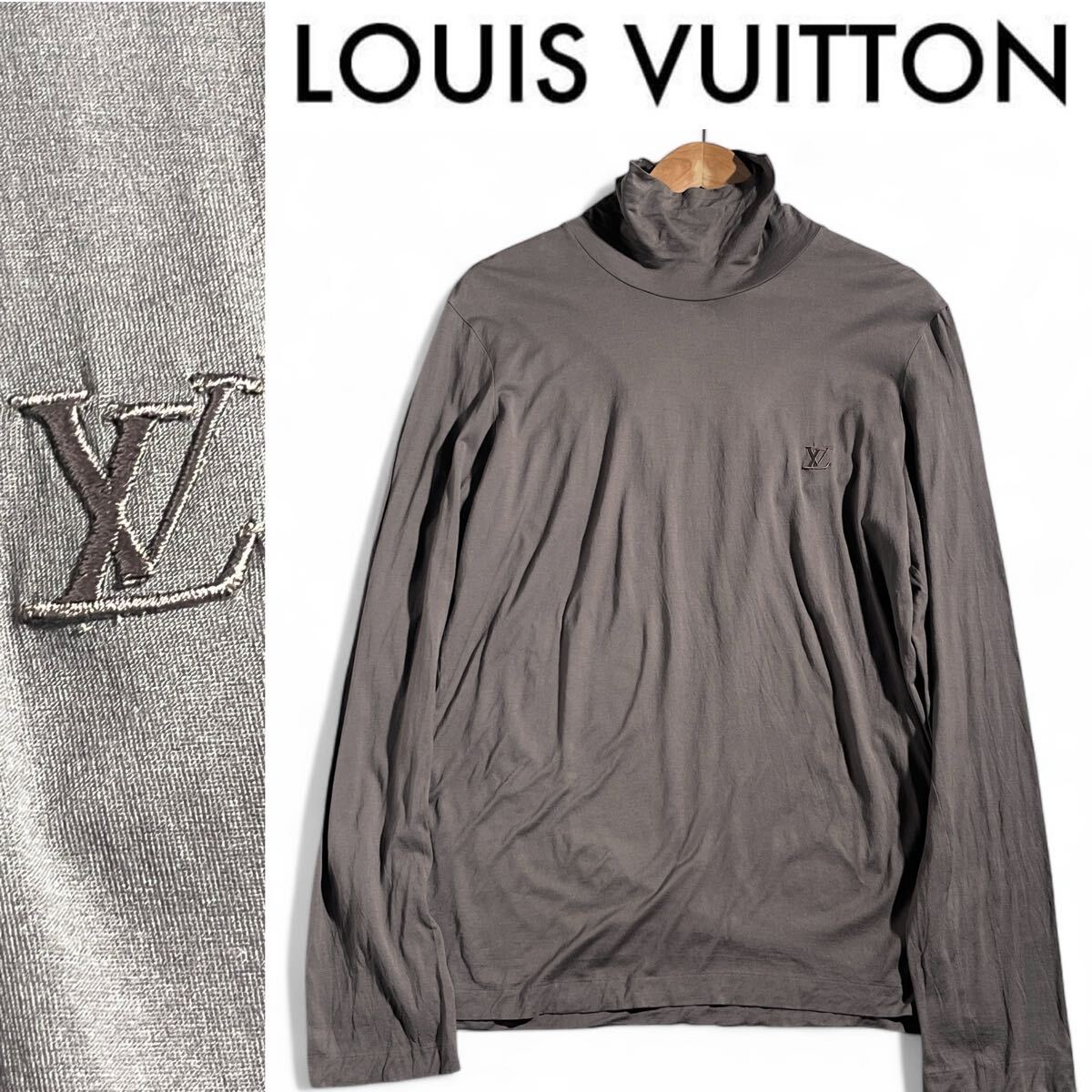 > 美品/ L ●LOUIS VUITTON 【ワンポイントLV刺繍ロゴ】ルイヴィトン メンズ ハイネック 薄手セーター カットソー コットン アッシュグレー
