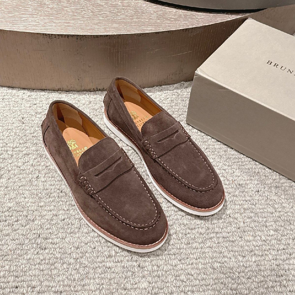- ダークブラウン25.0cm ★送料無料★ブルネロクチネリ★メンズスエード ペニーローファー, ホワイトソール, カジュアルシューズ