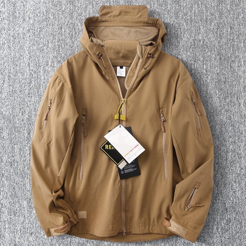 - 新品 国内未販売 ソフトシェルジャケット アウトドア 裏起毛 フード付き 防風 多ポケット マウンテンパーカ メンズ ジャケット 茶 T7025-XL