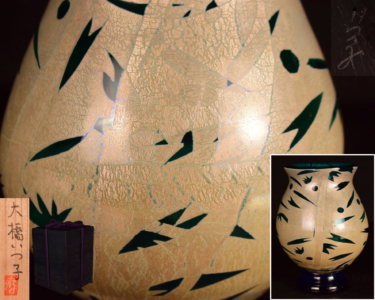 X19 【泉美】大橋いつ子作 吹きガラス 台付花入 花瓶 花生 花器 共箱入