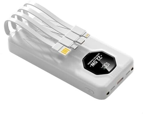 - PD22.5W 20000mAh モバイルバッテリー 4ケーブル内蔵 5台同時 PSE LCD表示 LED ホワイト