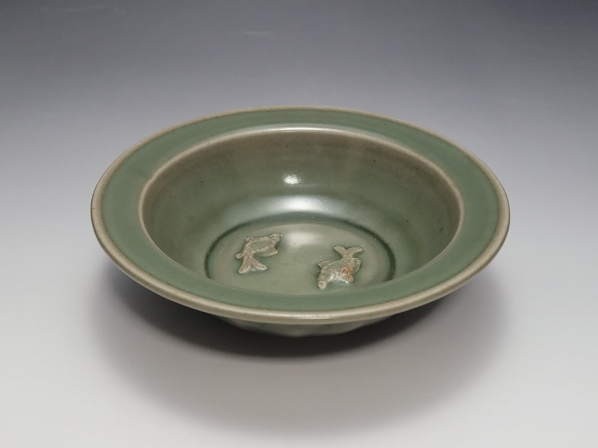 - 青磁 龍泉窯 陽刻双魚紋 筆洗 時代唐物 幅約13.5cm / 宋元時代 書道具 書画道具 文房具 古美術 唐物 人間国宝 李朝 高麗 古玩 古董