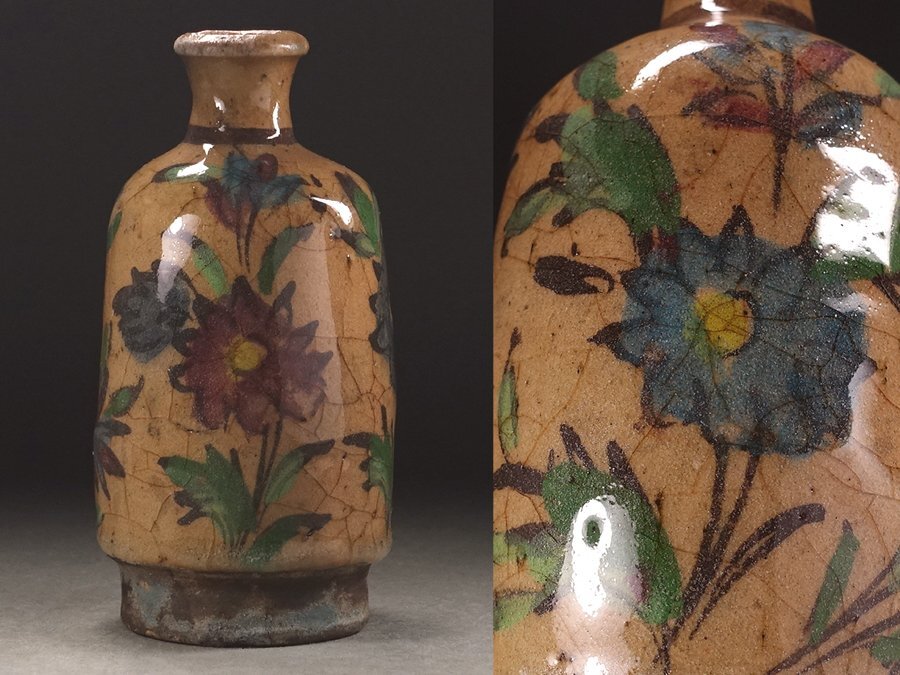> ∇花∇マジョリカ陶芸 19世紀~20世紀初頭ペルシャ イラン・ガージャール朝 錫釉彩色花文花瓶 高さ16.3cm 見立て茶道具としても