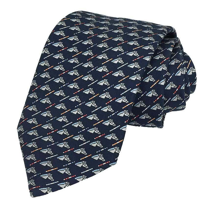 > 送料無料 HERMES エルメス ネクタイ 馬 COLOUFUL JUMP シルクツイルタイ ネイビー系 未使用 新古品 aq6874