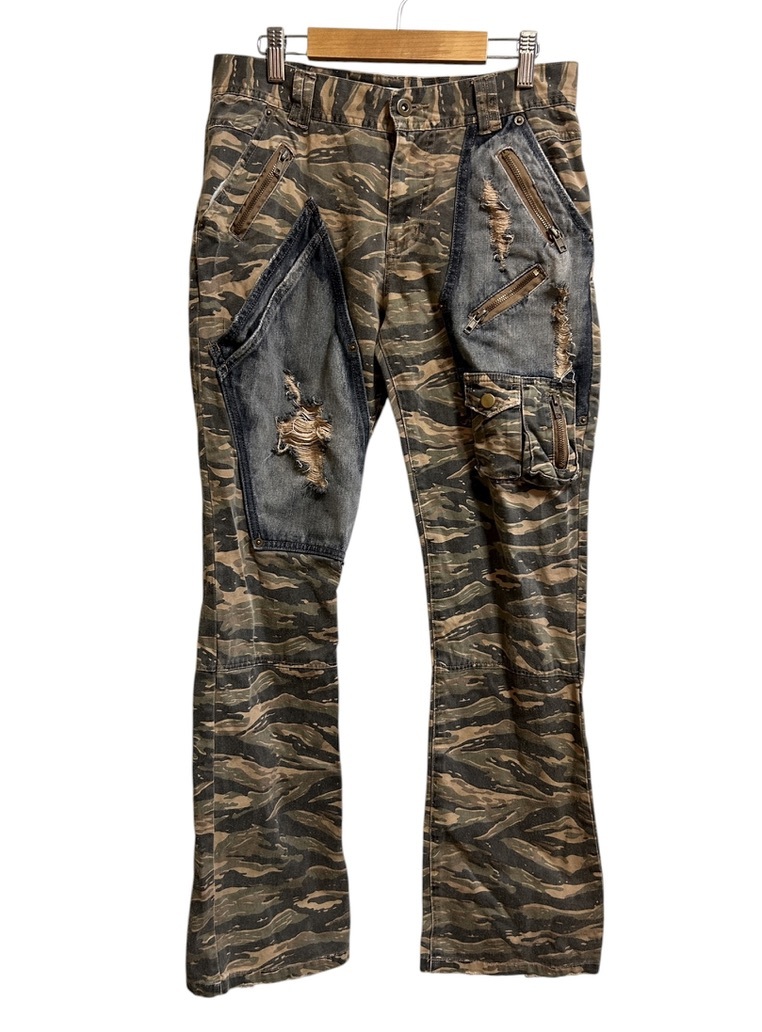 - 00s y2k▽CLONEDEVGRU クローンデブグル ブーツカット フレア タイガーカモ デニム パンツ M 迷彩 カモフラ ダメージ加工