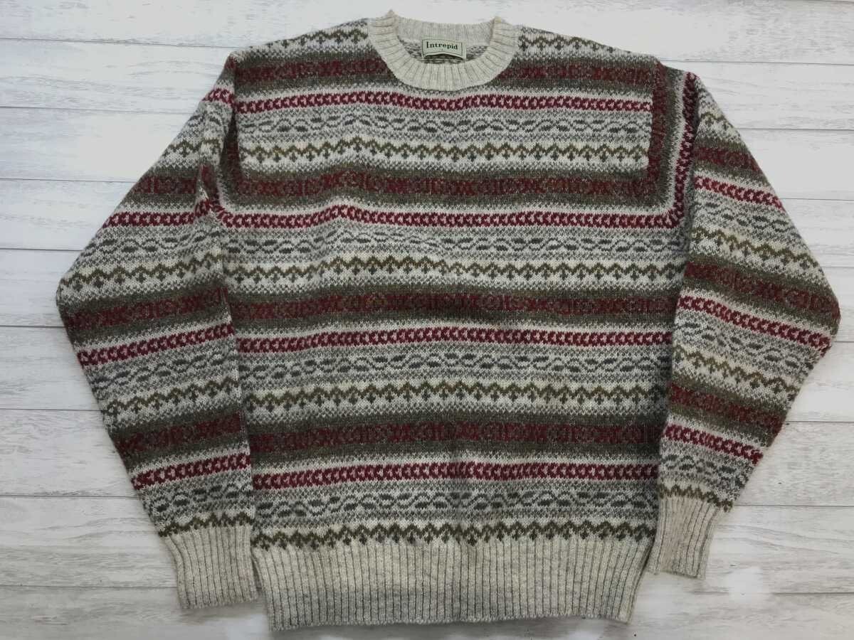 > イントレピッド Intrepid レトロ オールド アメカジ アウトドア 総柄 ジャガード ボーダー ニット セーター メンズ ウール100% L ベージュ