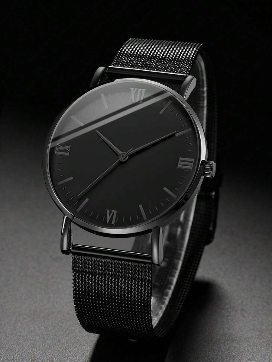 - 腕時計 メンズ クォーツ メンズ ブラックメッシュバンド ミニマリスト ローマ数字ダイヤル クォーツ腕時計