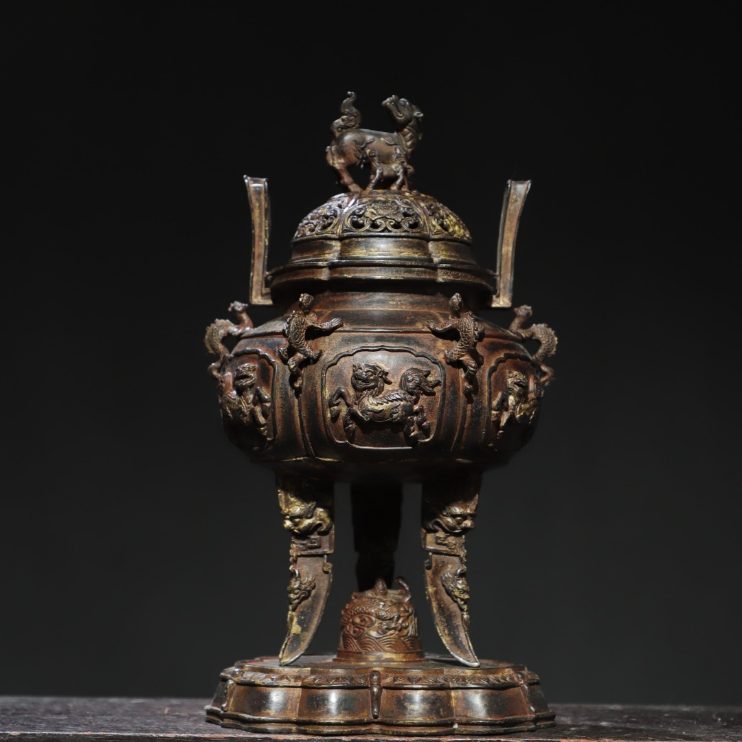 - 旧蔵 古銅彫 泥金 神獸 熏香炉 古擺件 古置物 中国古玩 骨董品 時代物 稀少唐物