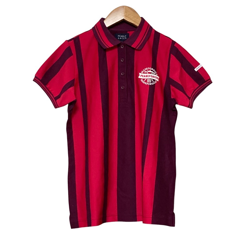 - 未使用 PEARLY GATES パーリーゲイツ ロゴ刺繍 ストライプ 半袖 ポロシャツ カットソー ゴルフウェア サイズ0 ピンク