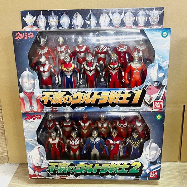 ご覧いただき誠にありがとうございます。不滅のウルトラマン戦士1 不滅のウルトラマン戦士2 2箱セットのご紹介です。ブランド:バンダイ商品名:不滅のウルトラ戦士セット1内容:歴代ウルトラのヒーロのソフビ人形が11体がセットになったセット商品名:不滅のウルトラ戦士2内容:人気シリーズのリニューアル第2弾として登場サイズ:全高約120mm~130mm(キャラクターにより異なる)現在は生産終了しており、市場では希少な商品となっております。未開封の中古品です。外箱には経年保管、劣化による箱擦れ、傷汚れ、多少の変色があります。また未開封の為、箱を開封しての検品は行っておりません。人形本体に経年劣化、汚れ等不具合がある場合がございますので、予めご了承ください。コンディション・長期保管品です。・外箱に大きなダメージはありません。・付属品は画像の物が全てです。・現状のままでのお渡しになります。・商品の状態につきましては、添付画像をご確認ください。こちらの商品は送料無料でお届け致します。配送方法は当社指定の方法で発送いたします。運送会社の指定は承っておりませんのであらかじめご了承ください。 お探しの方お見逃しなく!!ご来店頂ければ実際に商品の状態もご確認頂けます。店頭でのお支払い・引き取りも可能でございます。ご不明な点や、ご質問などございましたらどうぞお電話、メールでも結構です★どうぞお問い合わせくださいませ。 Y20251111-02