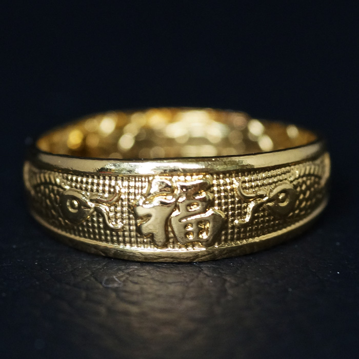 - [RING] 24K Gold Plated ラッキー 風水 福文字 出世 金運 家庭運 鯉 魚 デザイン 7mm ワイド フリーサイズ ゴールド 巻指輪 リング