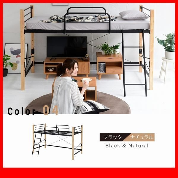 > ロフトベッド★天然木脚パイプベッド ハイタイプ シングル/高級感 安心感 床下空間利用 メッシュ床/ブラックxナチュラル/a4