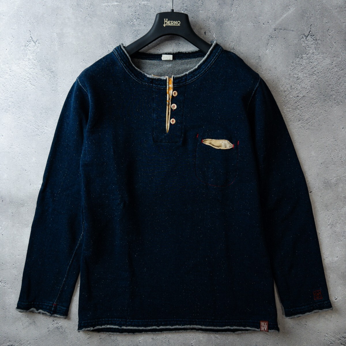 > 備中倉敷工房 ETERNAL エターナル 倉 ヘンリーネック 長袖 トップス カットソー 薄手 スウェット生地 ニット メンズ L 藍染 ロンT Tシャツ