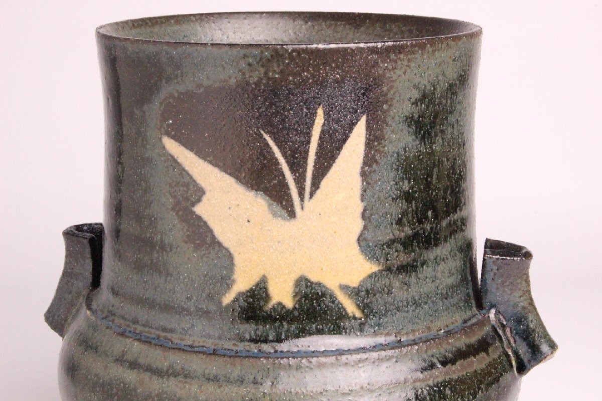 - 「狸庵RS」 加藤釥 作 蒼釉蝶文 花入 「共箱・栞」/ 瀬戸 赤津 蝶文 ☆本物保障☆k3re94j4q