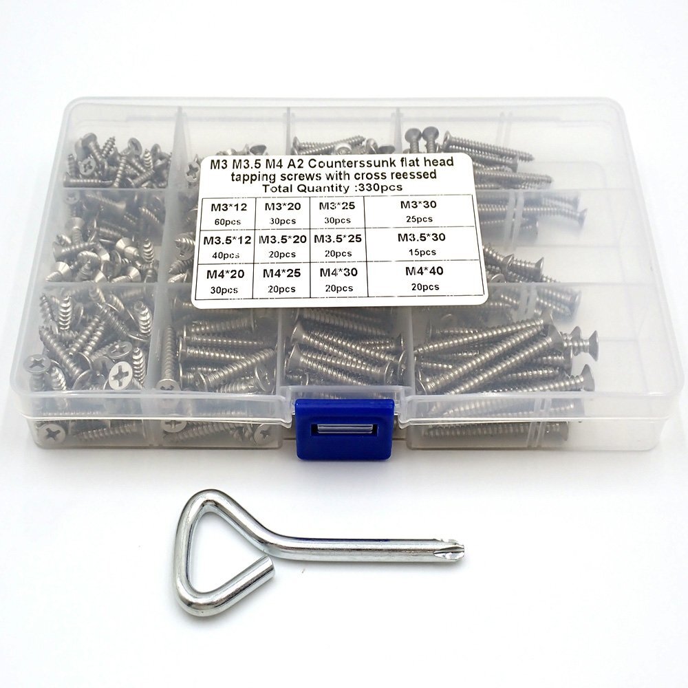 - 330本入 ステンレス 木ねじ M3 M3.5 M4 12mm 20mm 25mm 30mm 40mm 錆びない 皿頭 プラス ネジ 十字穴 タッピング 木工 工具 収納ケース付
