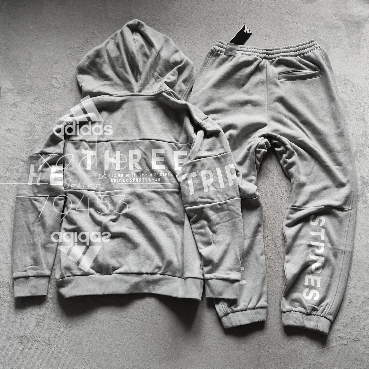 > 新品 正規品 adidas アディダス 上下セット スウェット パーカー パンツ セットアップ 灰 グレー 白 プリント 定価16500円 ゆるめ XL