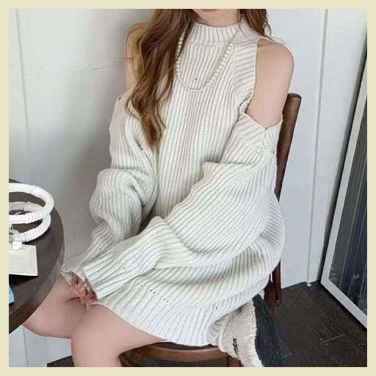 - オフショルダーセーター ホワイト ニットワンピミドル丈 フェミニンガーリー 韓国