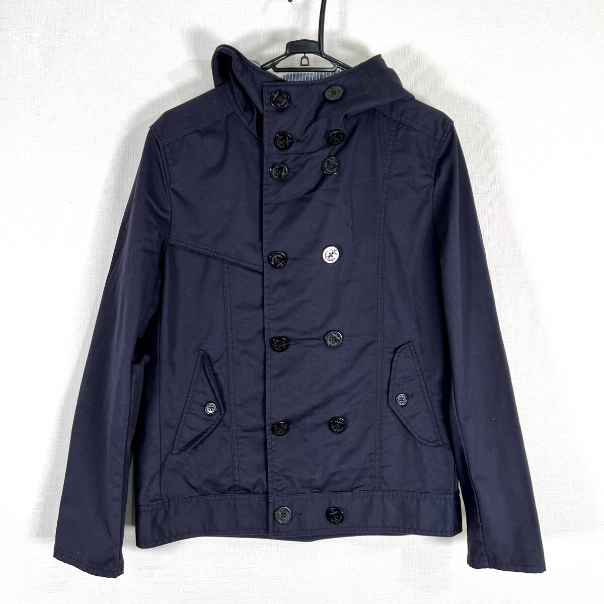- 【RAGEBLUE】レイジブルー ネイビー系 フード付き ダブルボタン カジュアルジャケット アウター フードッドコート メンズ Mサイズ【c033】