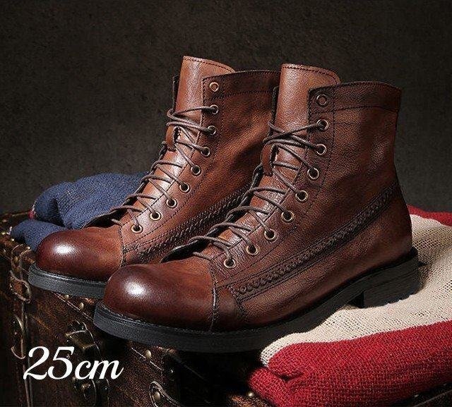 - ブーツ ワークブーツ メンズ シューズ マーティンブーツ 靴 紐靴 革靴 ハイカット カジュアル おしゃれ 四季兼用 ブラウン 25cm
