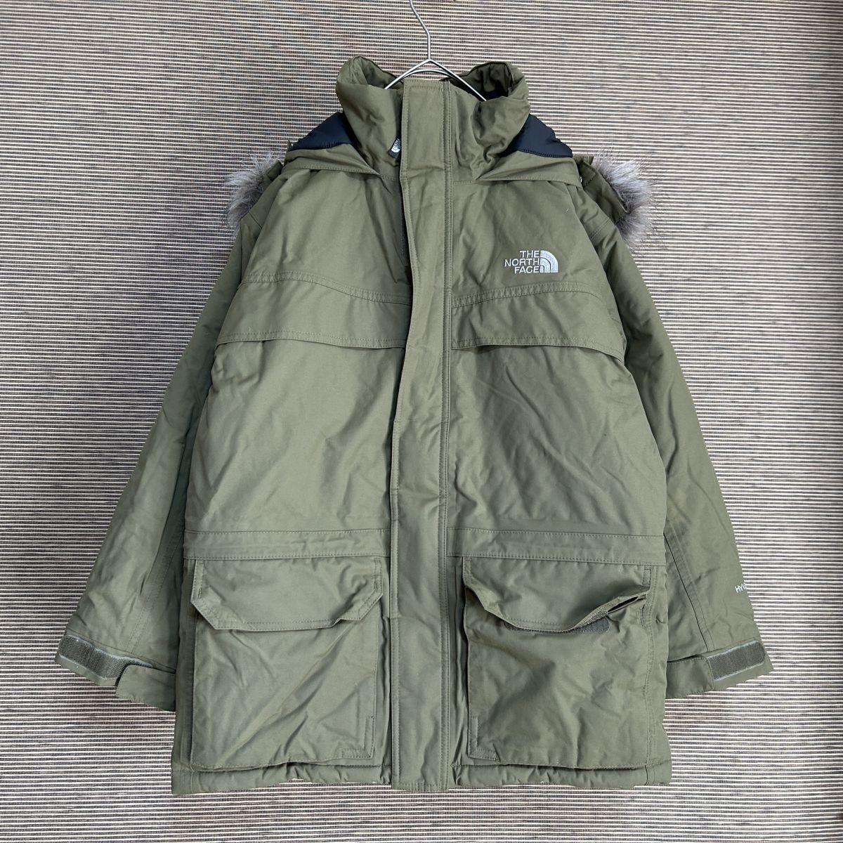 > ノースフェイス ダウンジャケット モッズコート カーキ子供150 フェイクファーC1 古着 入手困難 激レア 希少 人気 刺繍 キッズ