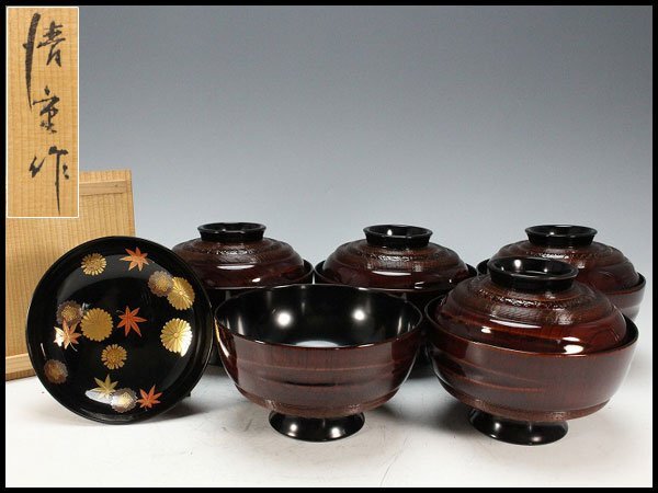 - 【金閣】小森清重作 樺 春秋蒔絵 煮物椀 共箱 五客 美品 保証 旧家蔵出 送料無料(YC549)