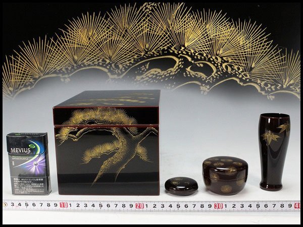 - 【金閣】茶道具 輪島 高級 沈金 松竹梅紋 茶箱 棗 香合 茶筅筒 揃 未使用 旧家蔵出 送料無料(RC823)