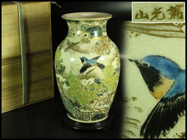 - 【金閣】錦光山 作 花鳥花瓶 明治時代 在銘 紫檀台付 旧家蔵出 送料無料(ZE505)