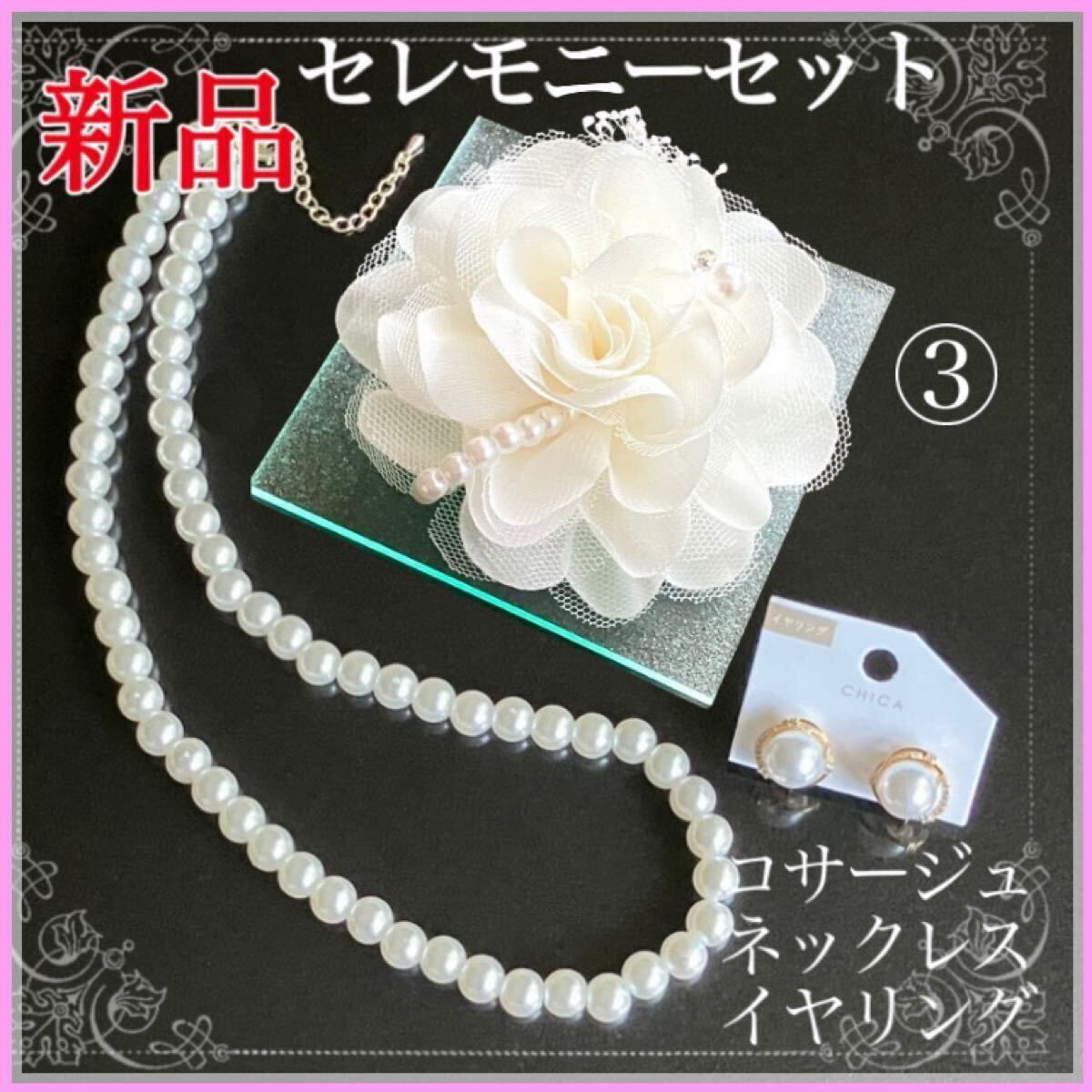 - 【新品】コサージュ 結婚式 セレモニーセット オフホワイト③ パールネックレス イヤリング フォーマルセット