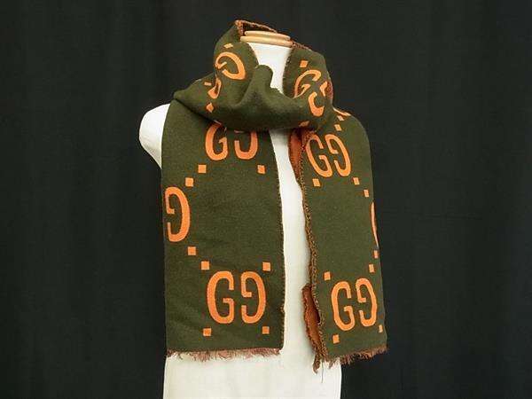 > 1円 GUCCI グッチ GG柄 ウール100% フリンジ マフラー ストール ショール 防寒具 レディース メンズ オレンジ系×カーキ系 FT2758