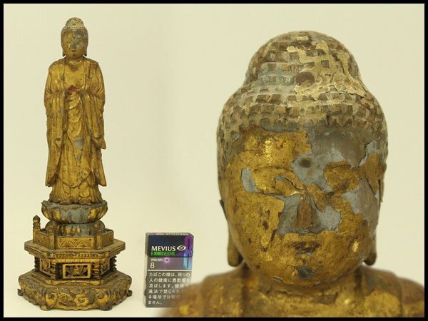 - 【銀閣】仏教美術 木彫 金彩 阿弥陀如来像 時代物 高35.5cm 旧家蔵出 送料無料(A511)