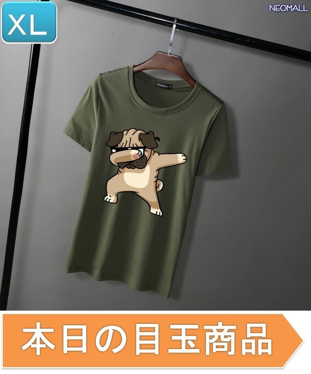 - 本日のお買得 ☆ 丸首 半袖 Tシャツ【346】 グリーン XLサイズ トップス シャツ シンプル イラスト 犬 ドッグ 春夏