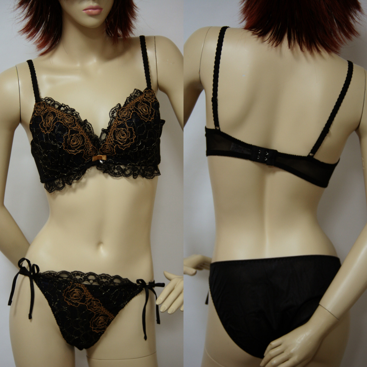 > 送料無料◆トリンプ◆Trimph◆セットアップ◆エレガント◆ローズフリルブラジャー&ショーツ(E/75/M/ブラック)【内蔵カップ:ネイビー】92371